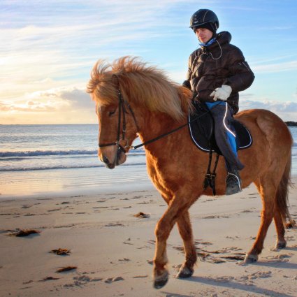 Sie werden am Hafen von Svolvær abgeholt und zur Hov Pferdefarm auf Gimsøy, eine Insel an der Atlantikküste, gebracht, wo Sie auf die Islandpferde treffen. Sobald Sie angekommen sind, wird es Zeit die Pferde zu satteln. Sie erleben die Schönheit eines Ausrittes im Sonnenuntergang durch den weißen Sand, über Hügel und entlang aufregender Relikte aus dem Wikingerzeitalter. Auf der Insel gibt es eine Vielzahl an alten Sagen und in Hov sind diese Relikte in der Landschaft zu erkennen. Ein Ausritt ist ein fantastischer Weg, die Schönheit der Lofoten zu erfahren; die langsam trottende Gangart, für die die Islandpferde bekannt sind, macht diesen Ausritt passend für Reiter mit allen verschiedenen Erfahrungsniveaus. Islandpferde sind für ihr gutes Gemüt bekannt und Sie können sicher sein, am Ende des Ausrittes einen Freund fürs Leben gefunden zu haben. Nachdem sie vom Pferd abgesessen und die Beine gestreckt haben, werden Sie nach Stamsund gebracht, wo das Hurtigrutenschiff auf Sie wartet.