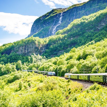 Gönnen Sie sich eine Fahrt mit der Flåmbahn - die vielleicht schönste Zugfahrt der Welt. Erleben Sie die wilde und schöne Berglandschaft mit Wasserfällen und steilen Berghängen rund um den Sognefjord.