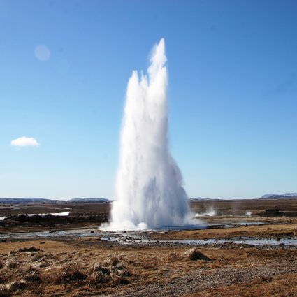 Vom Gullfoss Café geht es weiter in das geothermische Gebiet rund um die heißen, regelmäßig Fontänen-spuckenden heißen Quellen Geysir und Strokkur. Dieses Gebiet bietet eine beeindruckende Collage aus blubbernden Schlammtümpeln, zischenden Dampfschloten und bunten Algenablagerungen.
