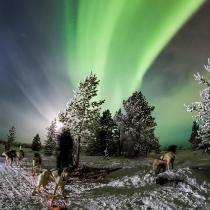 Ein professioneller, erfahrener Musher bringt Sie mit dem Hundeschlitten in die arktischen Fjorde und die Tundra, um nach den Nordlichtern zu suchen. Reisen Sie natürlich mit Hundekraft, nur mit dem Geräusch des Schnees, der Huskys und des arktischen Windes. Der Hundeschlittenführer steuert den Schlitten, während die Gäste Passagiere sind.