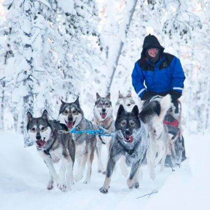 Eine Husky-Safari ist ein „Muss“-Erlebnis, wenn Sie Lappland besuchen. Ihr Reiseleiter zeigt Ihnen, wie Sie den Schlitten fahren und gibt Ihnen weitere Sicherheistanweisungen. Im Anschluss beginnen Sie eine unvergessliche Husky-Safari, auf der die liebevollen Huskies Sie mit dem Schlitten durch die verträumte Winterlandschaft ziehen. Sie fahren zu zweit (ein Fahrer und ein Passagier) und können auf halber Strecke tauschen. Genießen Sie die Aufregung der Hunde und ihre Gelassenheit, wenn sie das tun dürfen, was sie am liebsten machen – durch die verschneite Landschaft zu rennen.
