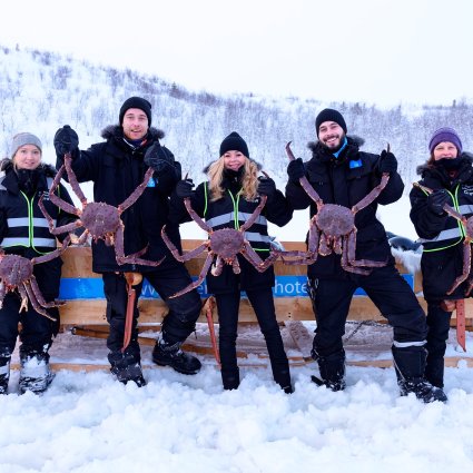 Sie werden von Ihrem Hotel (oder der Hurtigruten Anlegestelle) abgeholt und zu einem Fjord in der Nähe von Kirkenes gebracht. Nach dem kurzen Transport per Bus steigen Sie auf einen von einem Schneemobil gezogenen Schlitten um. Der Guide fährt Sie über den zugefrorenen Fjord. Hier lernen Sie, wie man die Königskrabben fängt und für die Zubereitung vorbereitet. Sie dürfen gern mit den imposanten Tieren für ein Foto posieren bevor es zu einem gemütlichem Restaurant weitergeht. Die Tour endet in einem schönen Restaurant am Fjord, wo Sie die Krabben nach norwegischer Art essen können. Das ausgezeichnete weiße Fleisch der Beine und Scheren ist besonders saftig und besitzt einen natürlich süßen Geschmack.