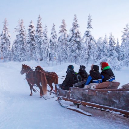 Zwei starke und edle Finnpferde ziehen einen Holzschlitten in den friedlichen Wald. Auf halber Strecke wird es eine Pause geben und mit ein wenig Glück können Sie die Nordlichter beobachten.