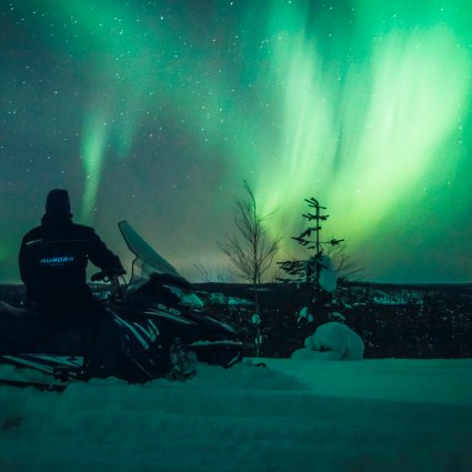 Jagen Sie mit Ihrem elektrischen Schneemobil (eSleds) nach dem Nordlicht, während Sie leise durch die arktischen Wälder vor den Toren von Rovaniemi im finnischen Lappland fahren.