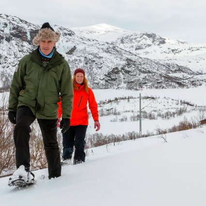 Erleben Sie den norwegischen Winter in Schneeschuhen! Die Tour startet in Flåm von wo aus Sie nach Aurland und zu dem Aussichtspunkt Stegastein gebracht werden.