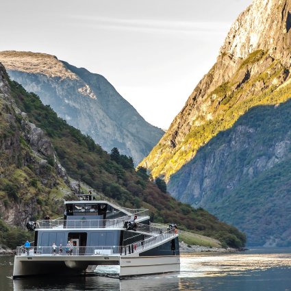 Von Flåm aus gehen Sie an Bord des neuen umweltfreundlichen, vollelektrischen Schiffes, das in 2 Stunden über den Nærøyfjord, der Teil des UNESCO-Weltkulturerbes ist, nach Gudvangen fährt. Das Schiff fährt mit Batterieantrieb und hält eine Geschwindigkeit von weniger als 10 Knoten ein, damit Sie die Landschaft in vollen Zügen genießen können. Das Design des Schiffes ist von einem Pfad inspiriert, der sich einen steilen Berghang hinaufzieht. Es ist 40 Meter lang und 15 Meter breit. Am Außendeck der Fähre können Sie das ganze Boot erkunden, vom Inneren haben Sie einen unvergleichbaren Panoramablick. Das nordisch inspirierte Innendesign bietet ein hohes Maß an Komfort.