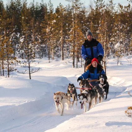 Machen Sie sich bereit für ein Winterabenteuer mit Huskies! Entdecken Sie die verschneiten Wälder vor den Toren Rovaniemis, während Sie Ihr eigenes Gespann mit Alaskan Huskies lenken. Genießen Sie die aufregende Hundeschlittenfahrt auf der langen Strecke und erfahren Sie mehr über die Schlittenhunde und ihr Leben auf der Huskyfarm.