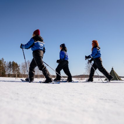 Mit Schneeschuhen an den Füßen erkunden Sie die schneebedeckte Landschaft von Rovaniemi. Erkunden Sie Orte, die sonst ohne Schneeschuhe unerreichbar wären. Ihr Guide erzählt Ihnen Geschichten und Fakten über Flora und Fauna der arktischen Natur. Erfahren Sie zudem etwas über die alte Lebensweise und über die traditionelle Verwendung von Zutaten aus der Natur. Aufgrund des gemächlichen Tempos dieser Tour können Sie auch allerlei Tierspuren im Schnee entdecken. Genießen Sie ein heißes Getränk und einen leichten Snack am Feuer, bevor Sie zum Apukka Resort zurückkehren.