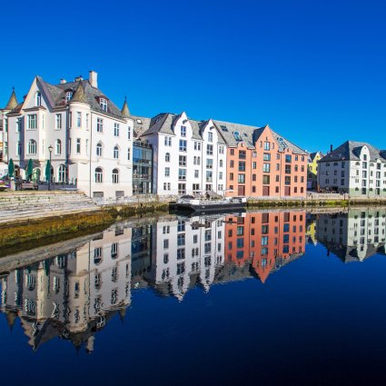 Havila-Landausflug in Ålesund: Auf dieser geführten Tour besuchen Sie die wunderschöne Stadt Ålesund, die weltweit für ihre Jugendstilarchitektur bekannt ist. Nach einem verheerenden Brand im Jahr 1904 wurde die Stadt im kontinentalen Baustil wieder aufgebaut.