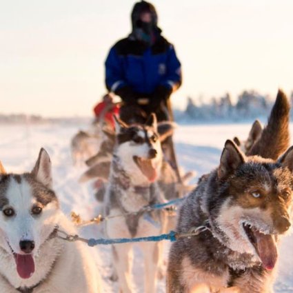 Guide, 5 km Husky-Safari (30 Minuten Fahrt), 2 Personen pro Schlitten (ein Fahrer, ein Passagier), warmer Beerensaft, warme Kleidung (Schneeanzug, Stiefel und Handschuhe).