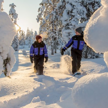 Bei dieser 2-stündigen Schneeschuhwanderung können Sie die winterliche Landschaft des finnischen Lapplands abseits der gekennzeichneten Pfade erkunden.