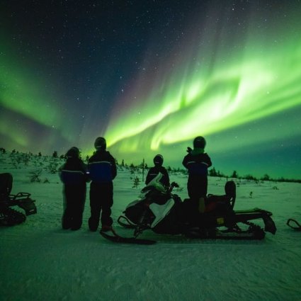 Machen Sie Fotos von den unvergesslichen Nordlichtern, den verschneiten Bäumen und den fernen Bergen oder genießen Sie einfach den Augenblick. Alle Schneemobile sind modern, einfach zu bedienen und auf Sicherheit ausgelegt.
