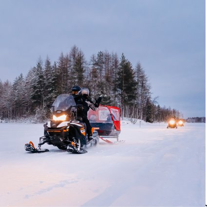 Erleben Sie eine aufregende Schneemobilsafari in Rovaniemi! Durchqueren Sie die verschneiten Wege in der lappländischen Wildnis. Dieses Abenteuer kombiniert Geschwindigkeit, herrliche Landschaften und die unberührte arktische Natur – eine unvergessliche Art, Finnlands Winterwunderland zu erkunden.