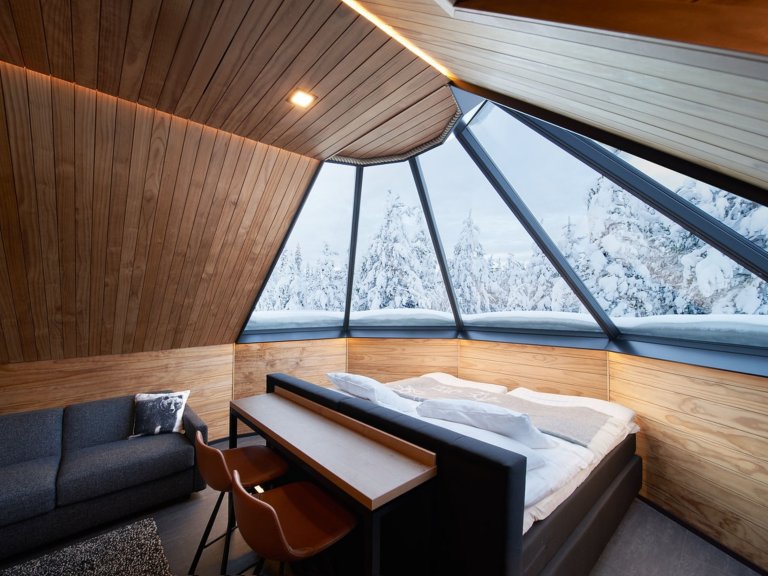 Die Aurora Cabins bieten eine magische Art, den Sternenhimmel und die tanzenden Nordlichter zu beobachten – und das alles von Ihrem warmen, gemütlichen Bett aus. Das Laser-beheizte Glasdach ist direkt über dem Bett, so dass Sie einen freien Blick auf den Nordhimmel haben.